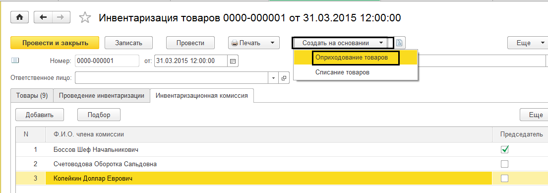 Для автоматического заполнения табличной части документа лучше всего вводить документ на основании документа «Инвентаризация товаров на складе»: Практикум № 47 31 марта на основании документа «Инвентаризация товаров на складе» сформировать документ «Оприходование товаров».