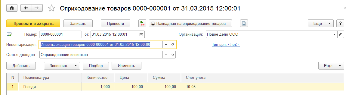 Для оформления факта оприходования товаров на склад в виду обнаруженных излишек на основании проведенной инвентаризации предназначен документ «Оприходование товаров».