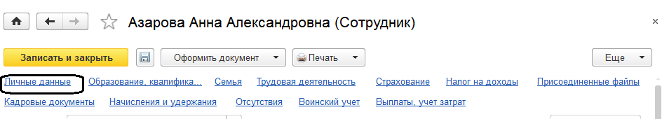 Для этого откроем карточку сотрудника, проверим уже имеющуюся информацию и корректность ее ввода