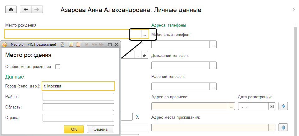 1.4. Контактные телефоны сотрудник не сообщил, заполним адрес регистрации (т.е. адрес по прописке). Ввод адреса осуществляется по адресному классификатору