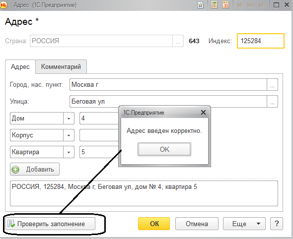 Адрес: г. Москва, ул. Беговая, д.4 кв.5, индекс получим автоматически. Также можно проверить адрес на соответствие адресному классификатору