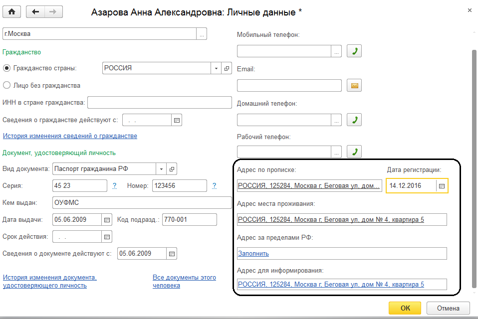 Дата регистрации по месту прописки – 14.12.2006. При сохранении адреса по прописке он автоматически скопируется для других видов адреса
