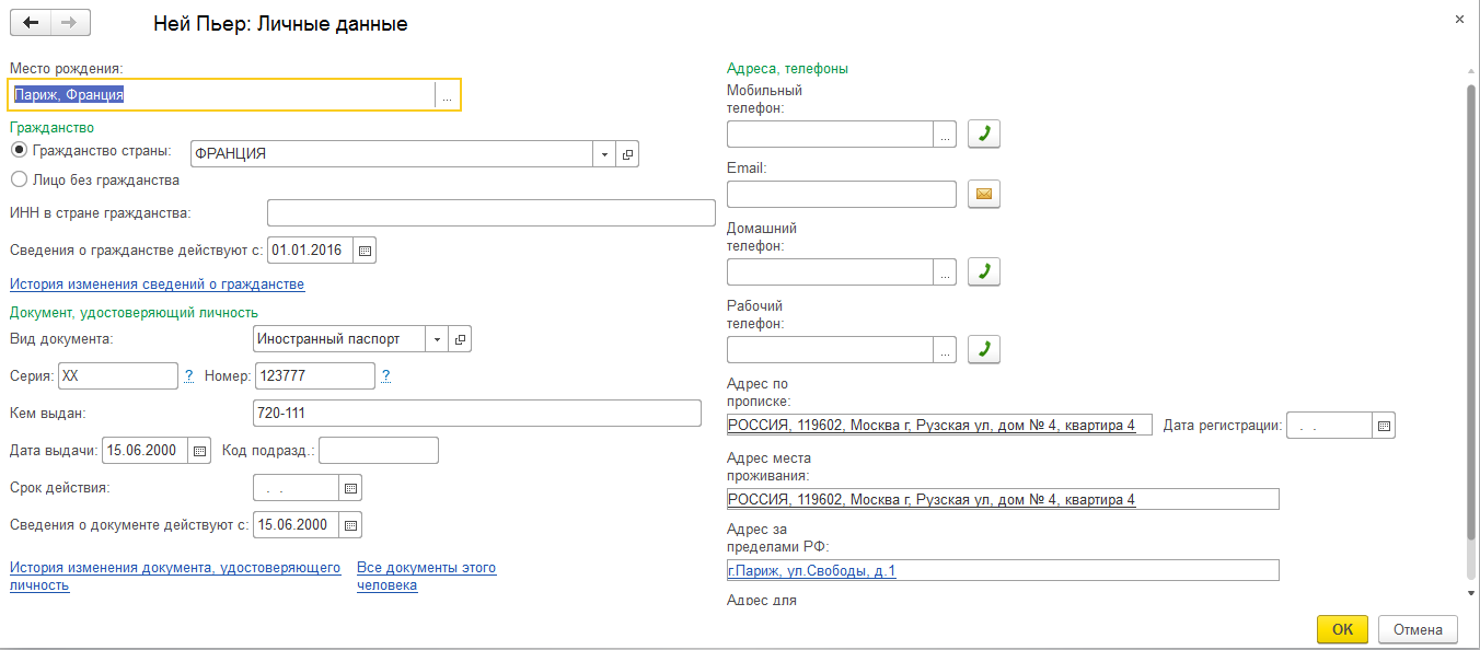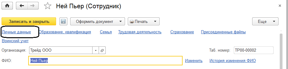 3. Примем на работу сотрудника иностранца. Необходимо создать нового сотрудника Ней Пьер (такое физическое лицо уже есть в базе), который будет принят на работу в ООО "Трейд". Из карточки сотрудника по ссылке "Личные данные" откроем и проверим личные данные иностранца.