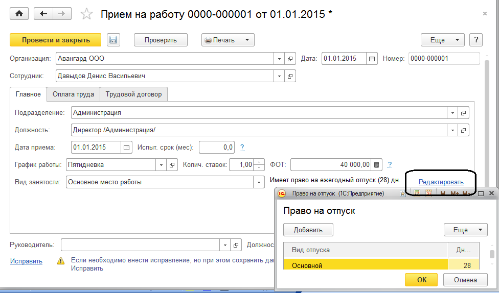 • Право на отпуск – заполняется автоматически по позиции штатного расписания и может быть скорректировано вручную по ссылке «Редактировать».