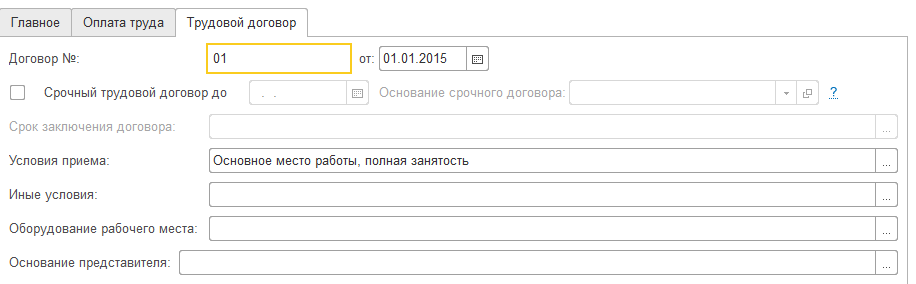 На закладке "Главное" заполняются существенные условия трудового договора. При этом: