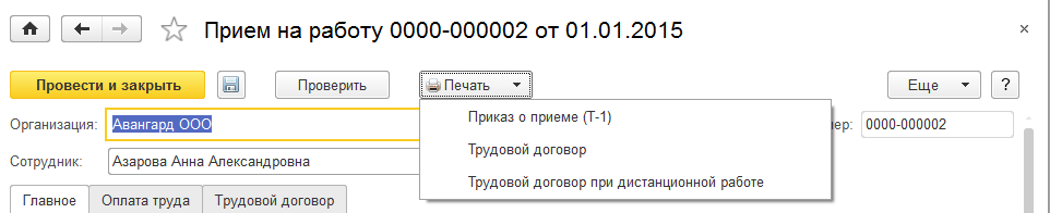 По команде «Еще – Провести» перепроведем документ и выведем на печать приказ о приеме на работу по форме Т-1.