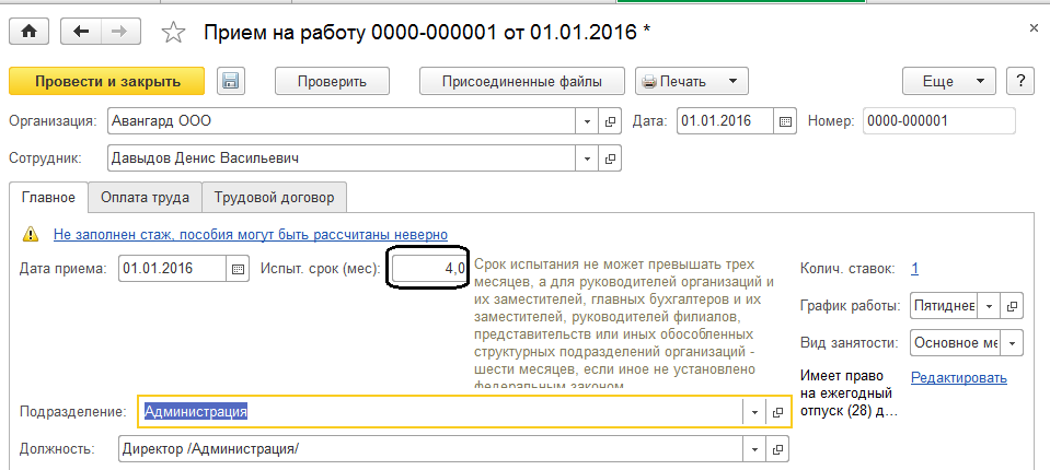 - В документе может быть указан испытательный срок – он указывает при необходимости в месяцах. При этом при вводе испытательного срока более 3х месяцев программа выдает подсказку-предупреждение;