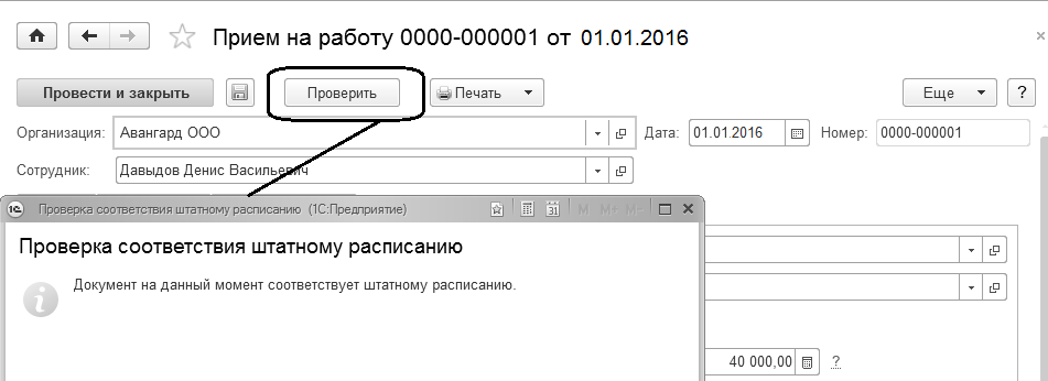 В кадровых приказах по движению сотрудников существует возможность выполнить проверку на соответствие приказа штатному расписанию по команде "Проверить".
