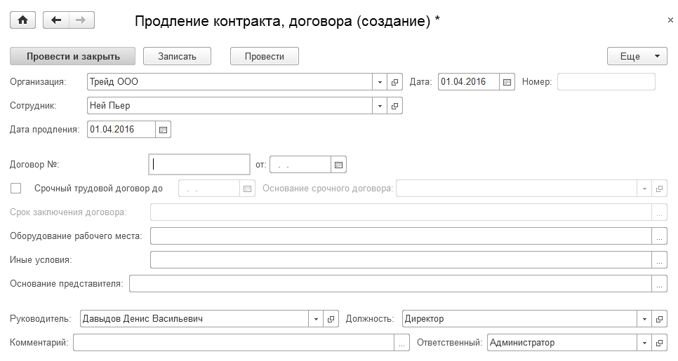 Если с сотрудником заключен срочный трудовой договор, то в последующем его можно продлить. Информация о срочном трудовом договоре вносится на закладке "Трудовой договор" документа "Прием на работу".