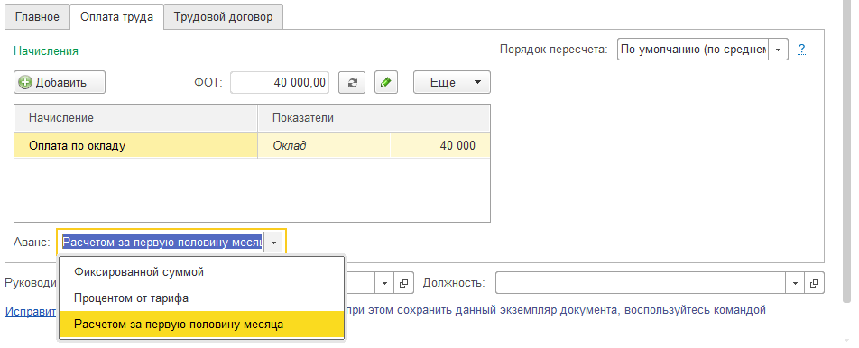 - Способ, по которому сотрудник будет получать аванс (подробнее – см. раздел "Настройка способа получения аванса"). При этом по умолчанию указывается способ "Расчетом за первую половину месяца";