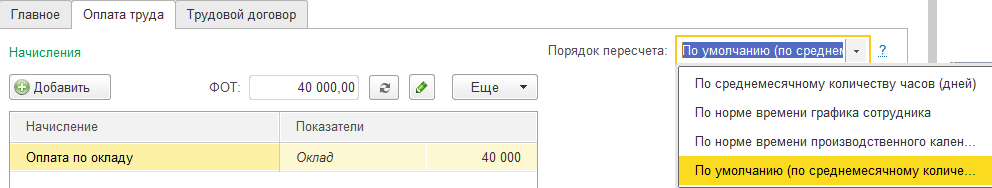 - Порядок пересчета оклада в часовую ставку. Напомним, что в настройке расчета зарплаты в программе указывается общий способ пересчета оклада в часовую ставку. Если же для какого-либо сотрудника этот способ следует изменить, то изменения вносятся непосредственно при приеме на работу.