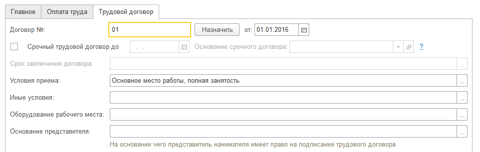 На закладке "Главное" заполняются существенные условия трудового договора. При этом: