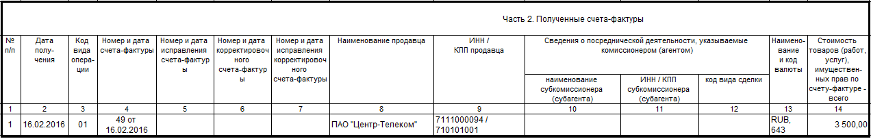 Фрагмент отчета Журнал учета полученных, выставленных счетов-фактур