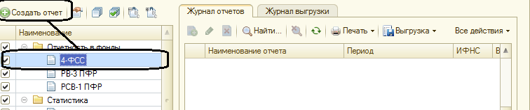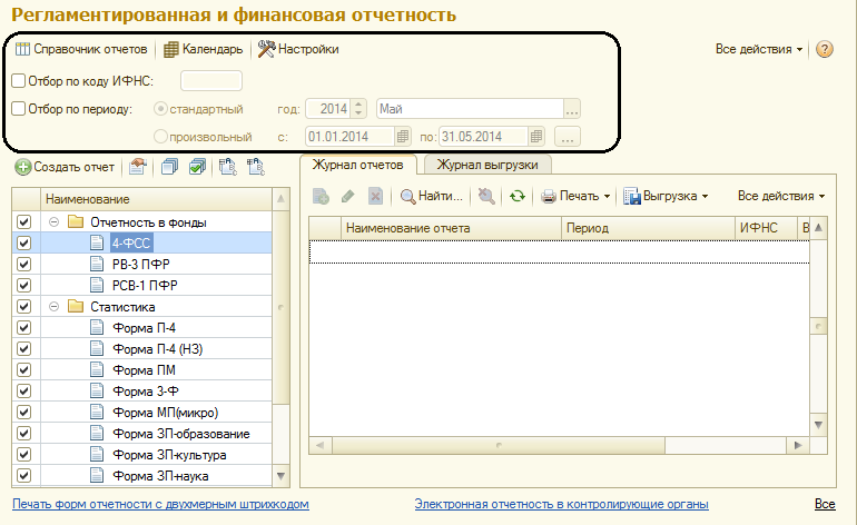 правой части формы расположены журнал отчетов и журнал выгрузки форм отчетности в электронном виде.