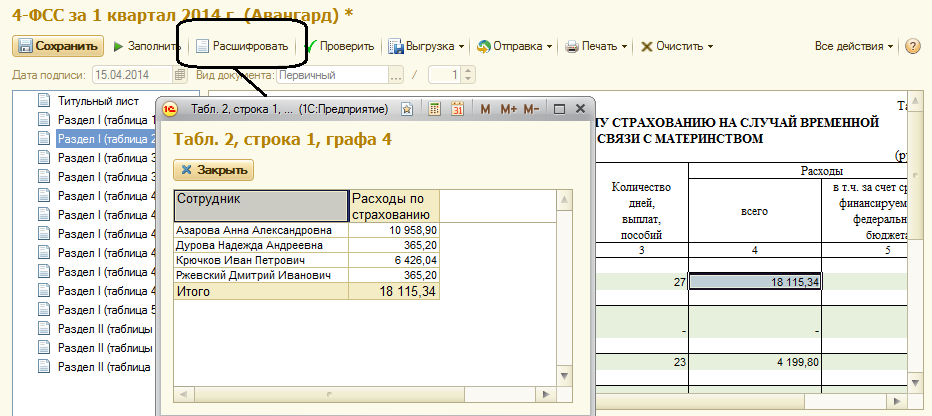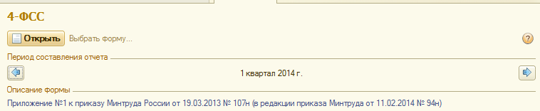 Сформируем форму 4-ФСС (форму РСВ-1 создадим вместе с пачками персонифицированной отчетности) за 1 квартал 2014 года. Для этого кликнем на форму два раза левой клавишей мыши, выберем нужный период и нажмем "Открыть". Далее отчет следует заполнить и проанализировать.