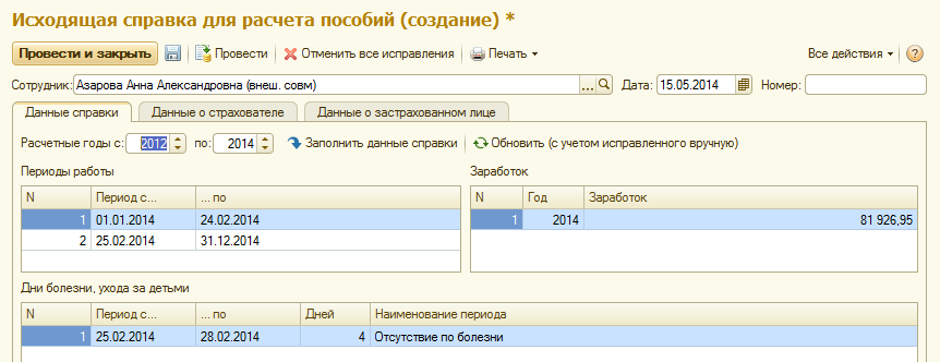 В разделе "Отчетность, справки / Справки для расчета пособий (исх.)" можно сформировать справки сотрудникам, которые они будут предоставлять в другую организацию для назначения пособий по социальному страхованию.