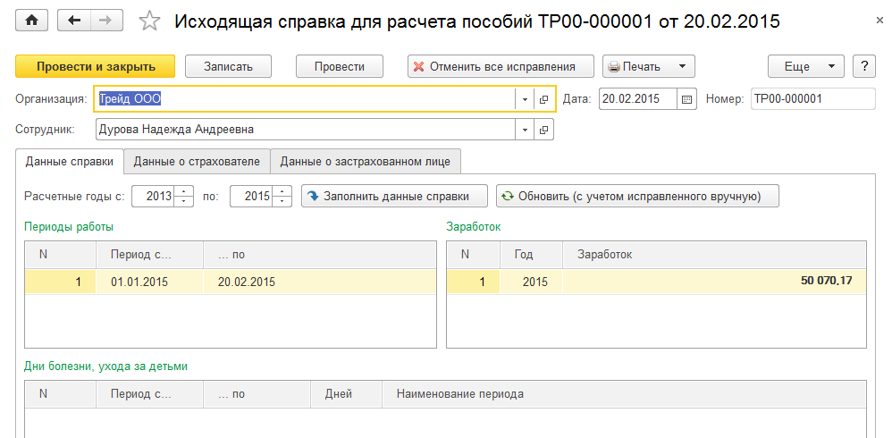 В разделе "Отчетность, справки / Справки для расчета пособий (исх.)" можно сформировать справки сотрудникам, которые они будут предоставлять в другую организацию для назначения пособий по социальному страхованию.