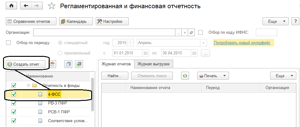 В правой части формы расположены журнал отчетов и журнал выгрузки форм отчетности в электронном виде.