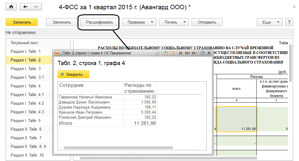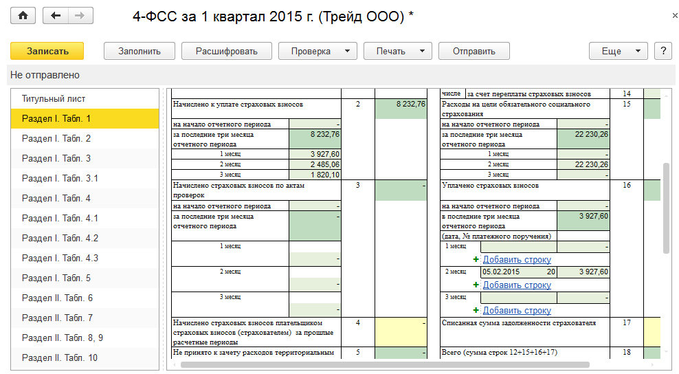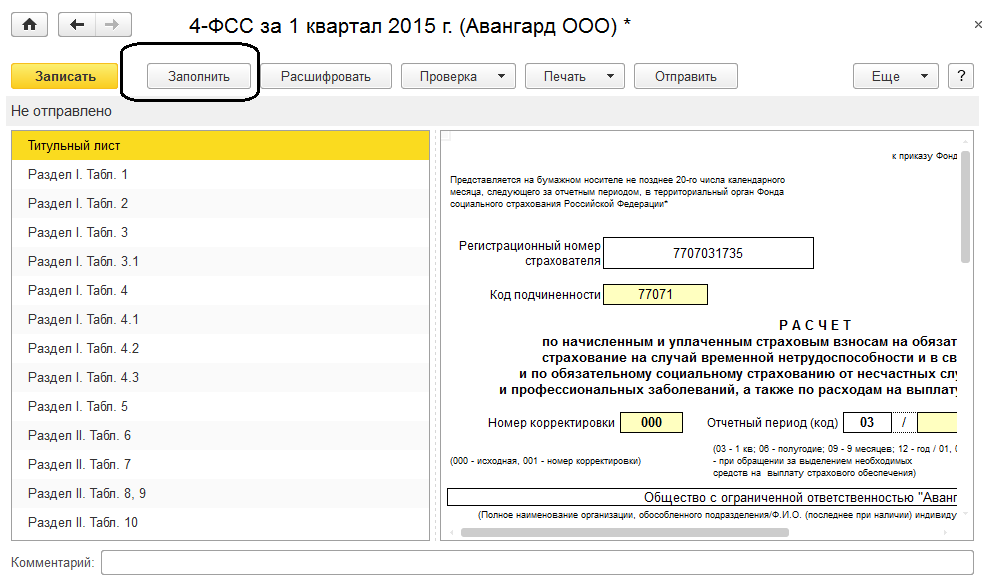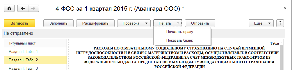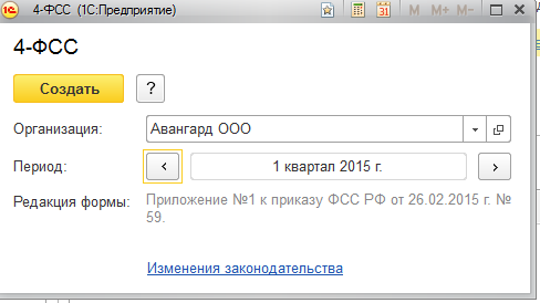 Сформируем формы 4-ФСС для ООО «Авангард» и ООО «Трейд» (форму РСВ-1 создадим вместе с пачками персонифицированной отчетности) за 1 квартал 2015 года. Для этого кликнем на форму два раза левой клавишей мыши, выберем нужный период и нажмем "Открыть". Далее отчет следует заполнить и проанализировать.