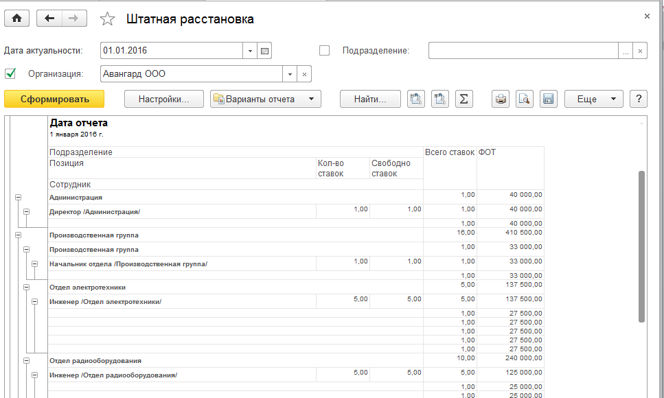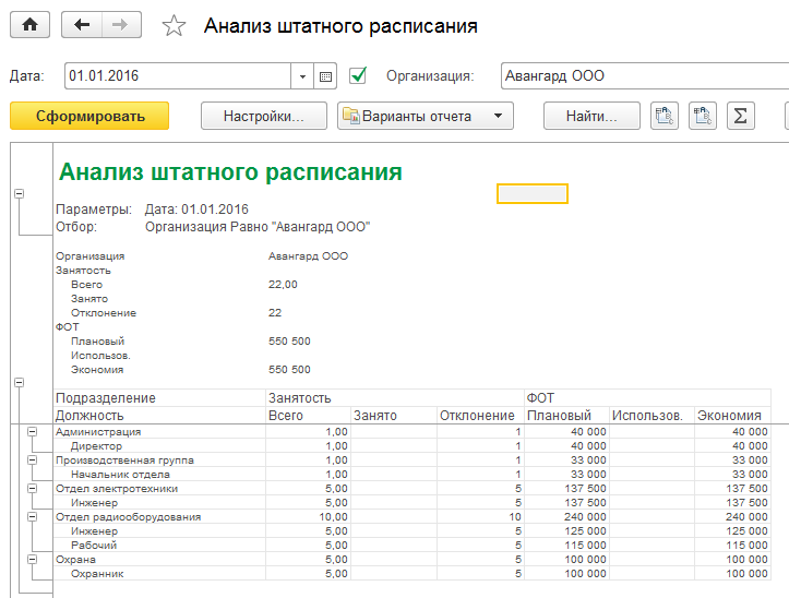 Отчет позволяет проанализировать, свободные и занятые ставки и отклонения от планового ФОТ по ним.