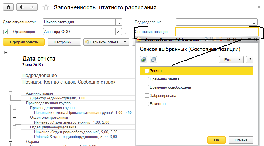 Отчет позволяет вывести список сотрудников, которые занимают позиции штатного расписания на заданную дату. Также здесь будут отображаться забронированные сотрудниками позиции. По команде "Настройки" можно выполнять отборы по состоянию позиции (как в варианте отчета "Заполненность штатного расписания").