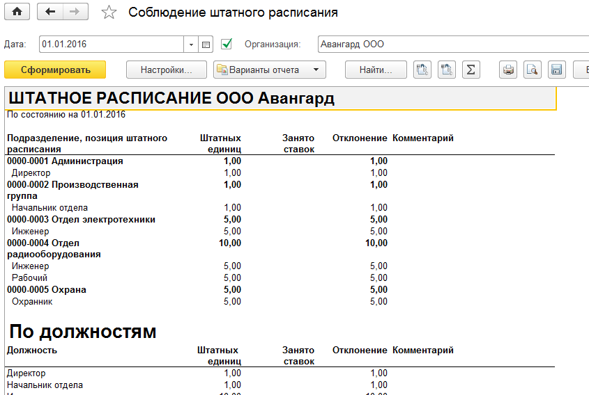 Отчеты составляются по утвержденным и незакрытым позициям. Многие отчеты целесообразно выводить отчеты после приема на работу сотрудников. В нашей учебной базе сотрудники еще не приняты. Примеры отчетов по штатному расписанию при занятых позициях (после приема на работу сотрудников) приведены на рисунках ниже.