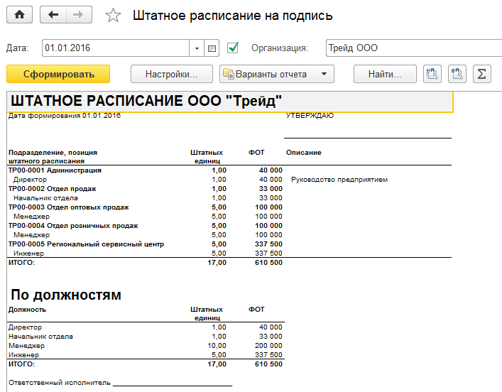 Отчет позволяет вывести штатное расписание в произвольной форме для внутреннего использования в организации и предварительного утверждения к форме Т-3.
