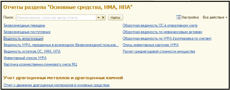 Для формирования отчета следует выбрать раздел "Основные средства, НМА, НПА" команда панели навигации "Отчеты по основным средствам, НМА,НПА".