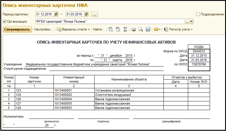 Отчет позволяет сформировать Опись инвентарных карточек по учету нефинансовых активов по форме 0504033.