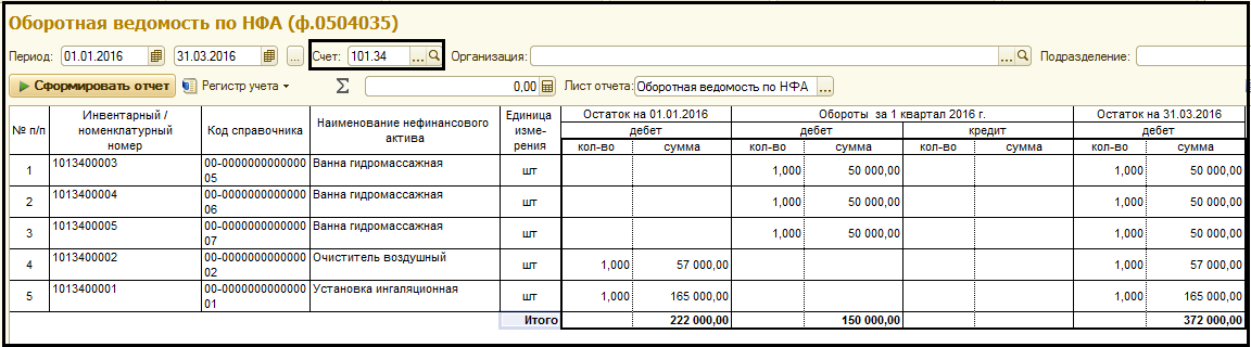 Отчет отражает наличие и движение НФА за выбранный период на счетах группы счетов 101 Основные средства, 102 Нематериальные активы, 103 Непроизведенные активы, 104 Амортизация, 105 Материальные запасы.