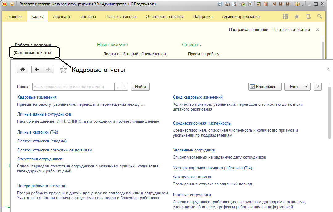 Для поиска ошибок в расчете зарплаты либо предоставления каких-либо сведений руководству или внешним получателям данных (статистика, ведомства и т.п.) используются отчеты по кадрам. Отчеты доступны в разделе "Кадры / Кадровые отчеты".