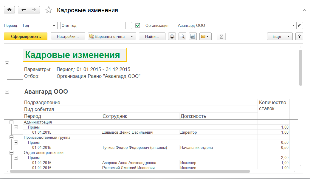 Отчет позволяет вывести пофамильный список принятых, уволенных и переведенных сотрудников за выбранный период