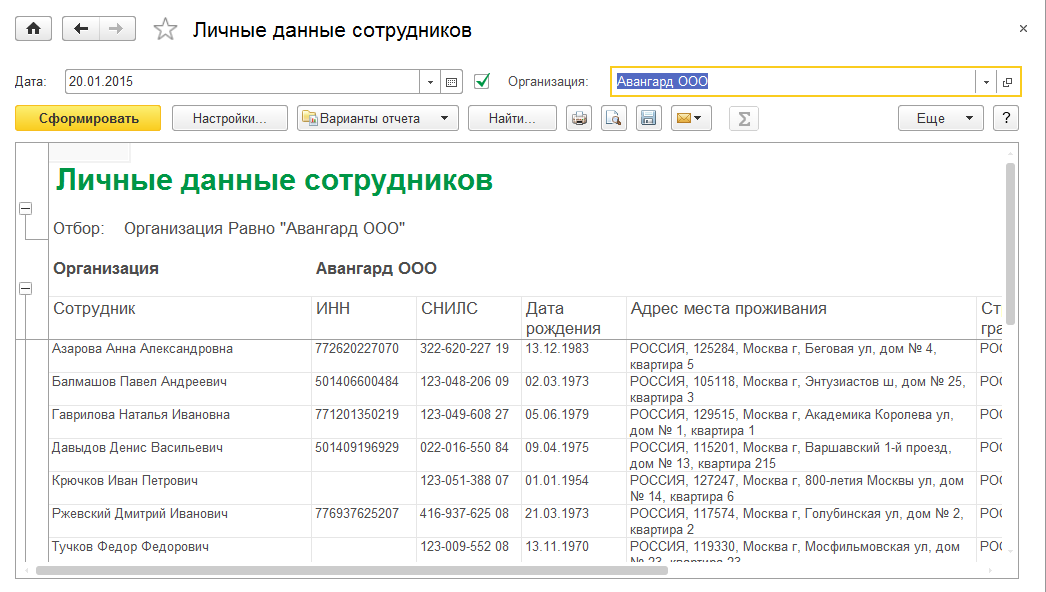 Отчет позволяет проверить полноту основных личных данных сотрудников.