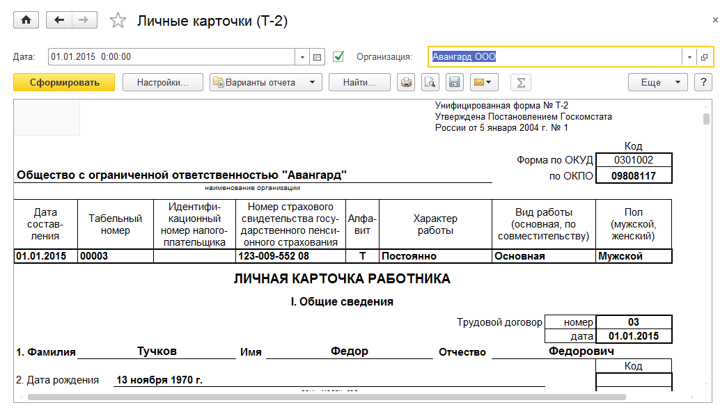 Выводится отчет по унифицированной форме Т-2 с актуальными на дату формирования сведениями.
