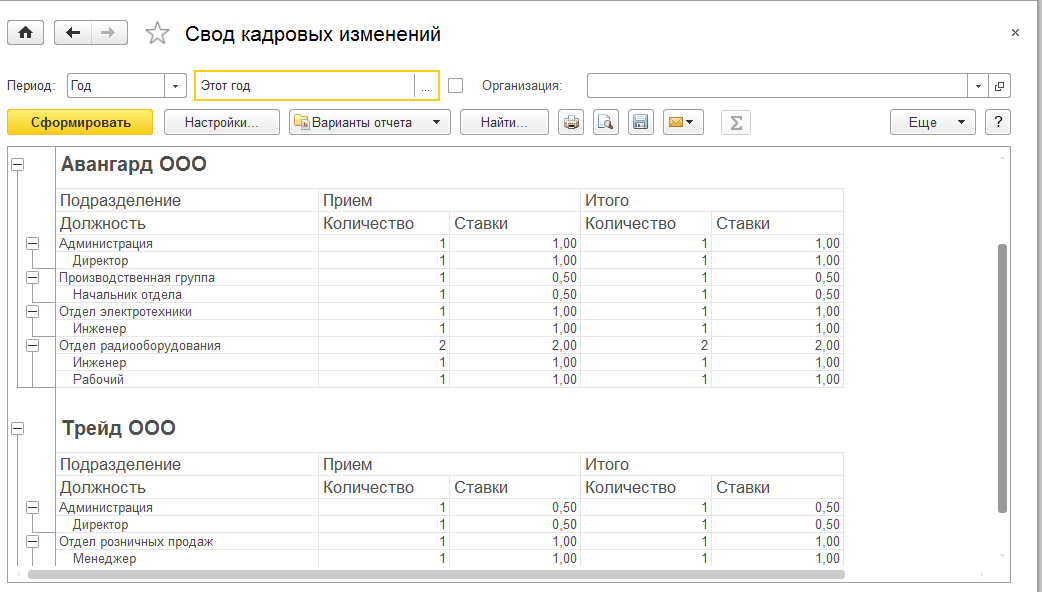Отчет позволяет вывести общую информацию (без указания конкретных сотрудников) о приемах, переводах и увольнениях за заданный период в разрезе подразделений и должностей.