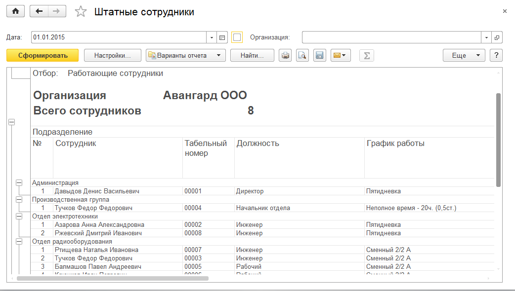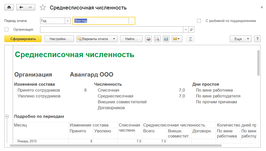 Отчет позволяет рассчитать списочную и среднесписочную численность за указанный период с учетом изменения состава, простоев, внешних совместителей и т.п.
