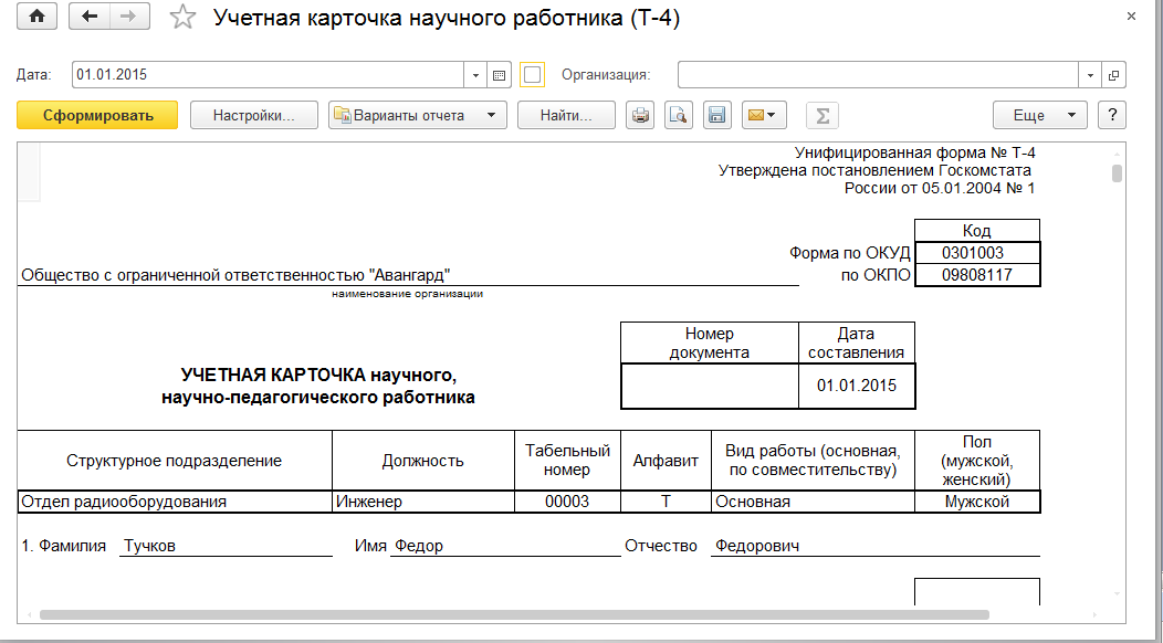 Выводится унифицированная форма карточки Т-4 с актуальными на дату отчета сведениями.