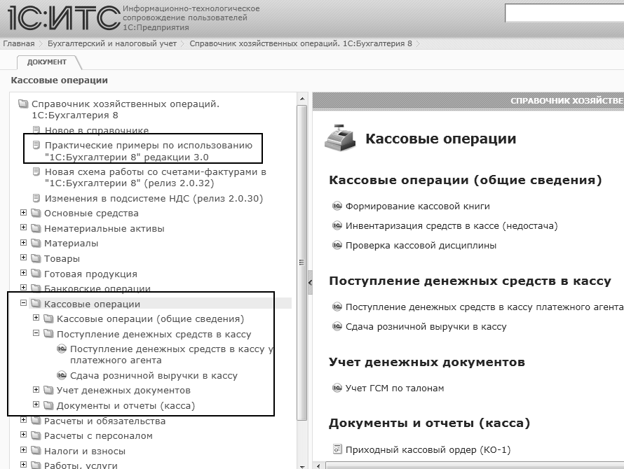 Для просмотра практических примеров по работе с кассовыми документами можно воспользоваться информационной системой 1С:ИТС. Для этого выполните следующее: