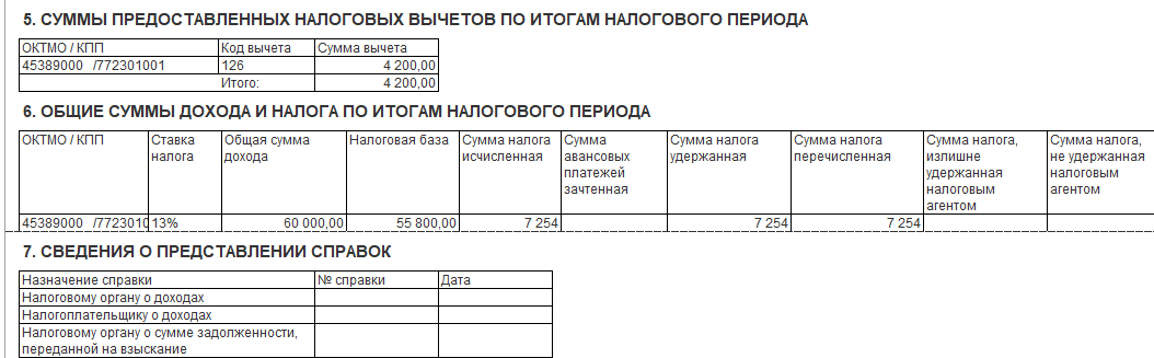 - Раздел 6 "Общие суммы дохода и налога по итогам налогового периода" выводятся в разрезе кодов ОКТМО/КПП;
