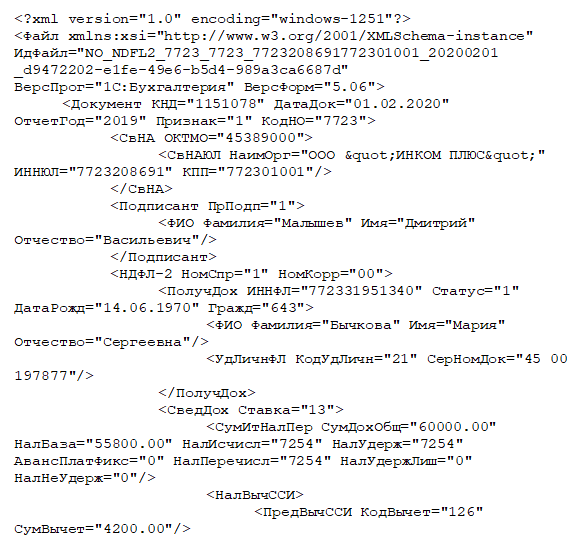 Рис. 9.5.7. Фрагмент электронной формы справки 2-НДФЛ для передачи в ИФНС