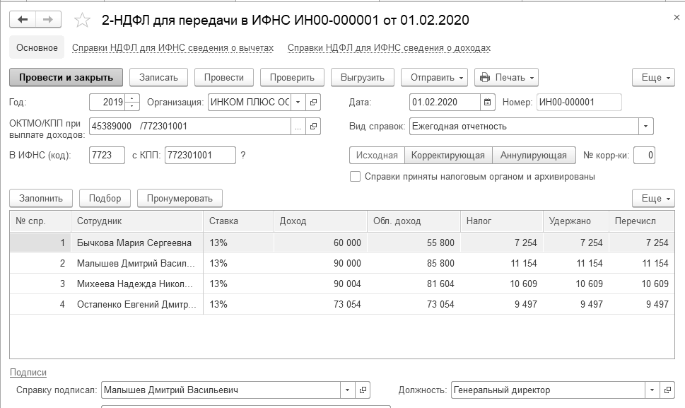 Создайте документ "2-НДФЛ для передачи в ИФНС" за 2019 год по всем сотрудникам организации "ИНКОМ ПЛЮС".
