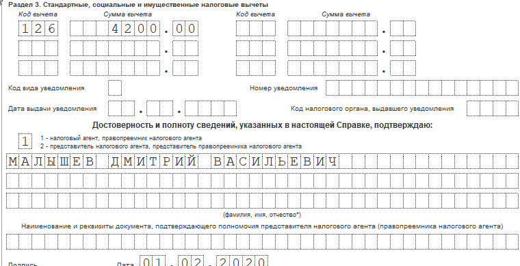 Итоговые данные вносятся в раздел 2, где отражается общая сумма начислений, доходы за минусом примененных вычетов, начисленный, удержанный и уплаченный налог.