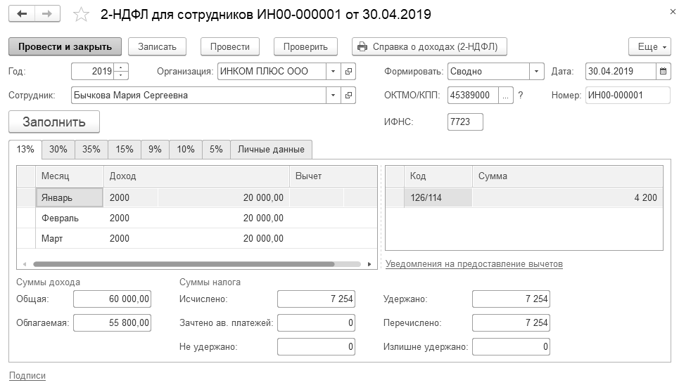 Сформируйте справку "2-НДФЛ для сотрудников" на 30.04.2019 года по сотруднице Бычковой М. С. организации "ИНКОМ ПЛЮС".