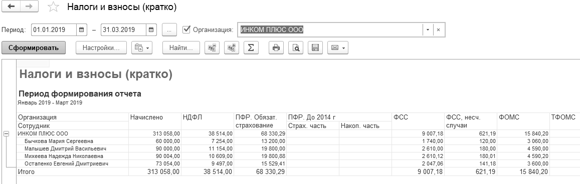 Сформируйте отчет "Налоги и взносы (кратко)" за I квартал 2019 года. Для заполнения отчета нажмите кнопку "Сформировать" (рис. 9.5.3).