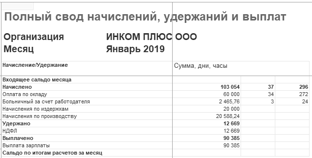 Сформируйте отчет "Полный свод начислений, удержаний и выплат" за январь 2019 года по организации "ИНКОМ ПЛЮС".