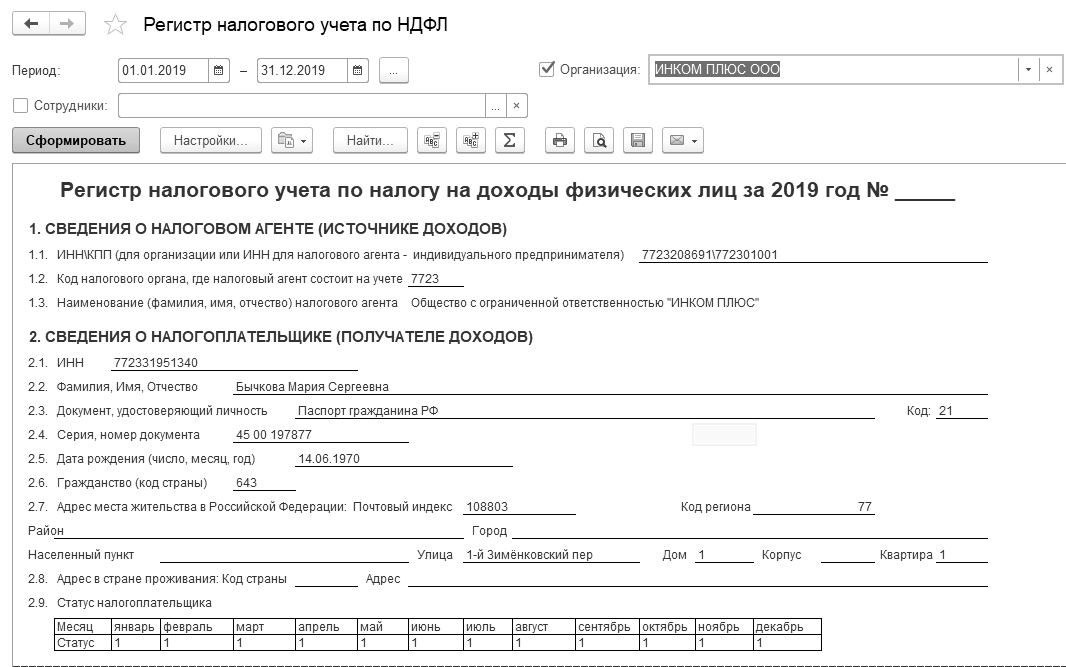 Создайте отчет "Регистр налогового учета по НДФЛ" за 2019 год по всем сотрудникам организации "ИНКОМ ПЛЮС".