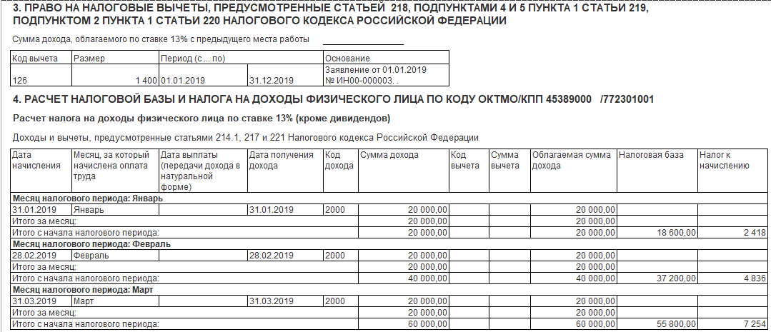- Раздел 4 "Расчет налоговой базы и налога на доходы физического лица" – раздел формируется отдельно для каждого кода ОКТМО/КПП. Подраздел "Расчет налога на доходы физического лица по ставке _%" формируется отдельно по каждой ставке налога;