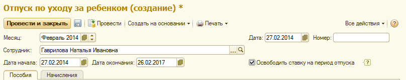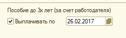 Если начисляется пособия до 3х лет, то устанавливается соответствующий флажок и дата окончания выплаты пособия (как правило, дата окончания отпуска).