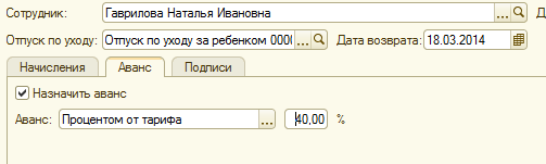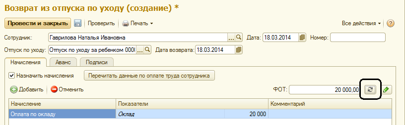 Сотрудница Гаврилова Н.И. прекращает отпуск по уходу за ребенком с 18.03.2014. Необходимо оформить возврат из отпуска с назначением оклада и пересчетом планового ФОТ, назначением аванса (40% от тарифа).