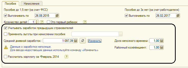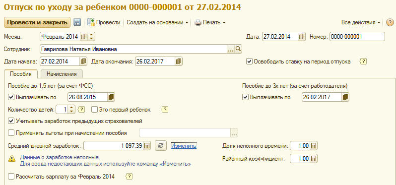 В этом документе можно изменить все параметры, влияющие на назначение пособия по уходу, за исключением среднего заработка, который фиксируется на дату начала отпуска.